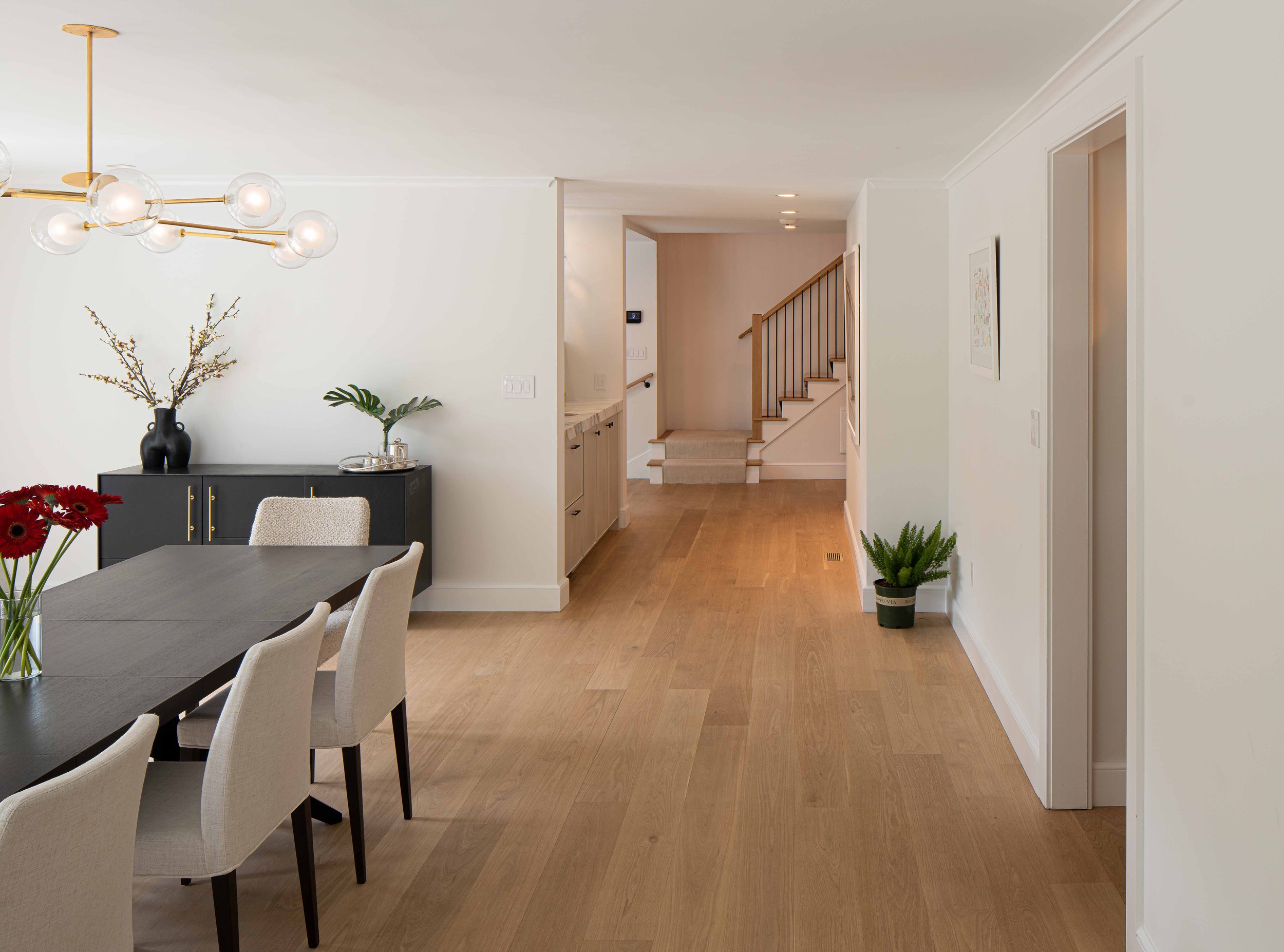 A large backyard, perfect for entertaining, provides the primary organizing method for this interior renovation and addition. Both formal and informal interior spaces sit on the edge of a large outdoor terrace and are connected through large windows and openings allowing the home to feel bright and airy. Our design and construction teams worked closely to ensure the addition integrated seamlessly with the existing home.